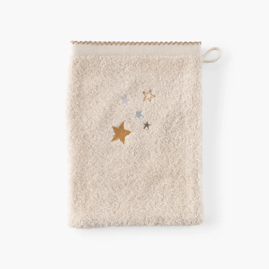 Venez compléter votre parure de naissance avec le gant de toilette Bienvenue. Il est disponible en 3 coloris différents : en nude, blanc et nature. Cela vous permet de mélanger les différents motifs jour, nuit, pluie et beau temps.