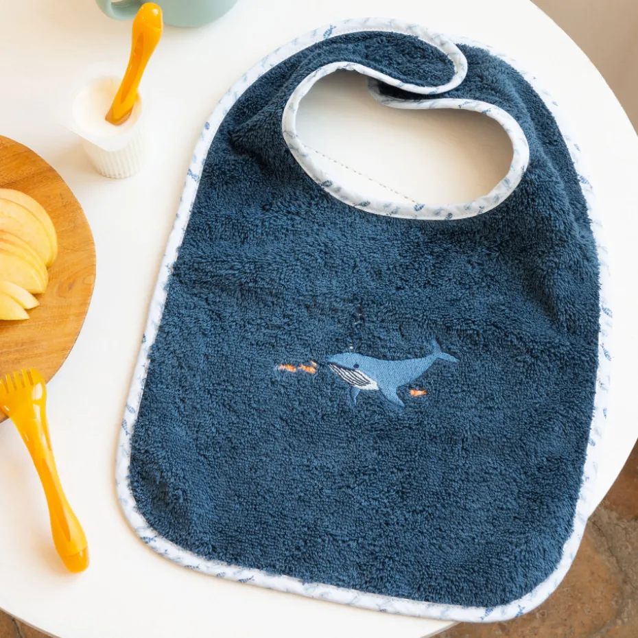 Nos stylistes ont imaginé avec la plus grande tendresse le bavoir de la gamme Océanos. Un modèle qui présente une belle broderie et une finition imprimée aux motifs poissons.