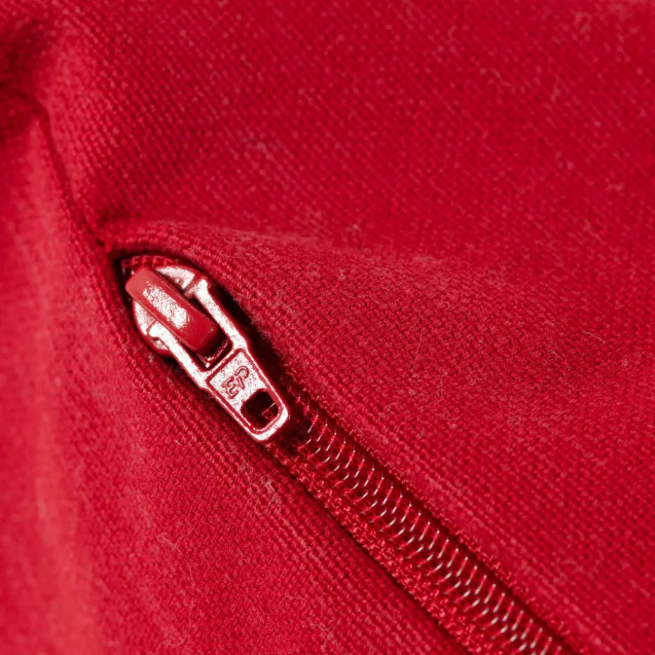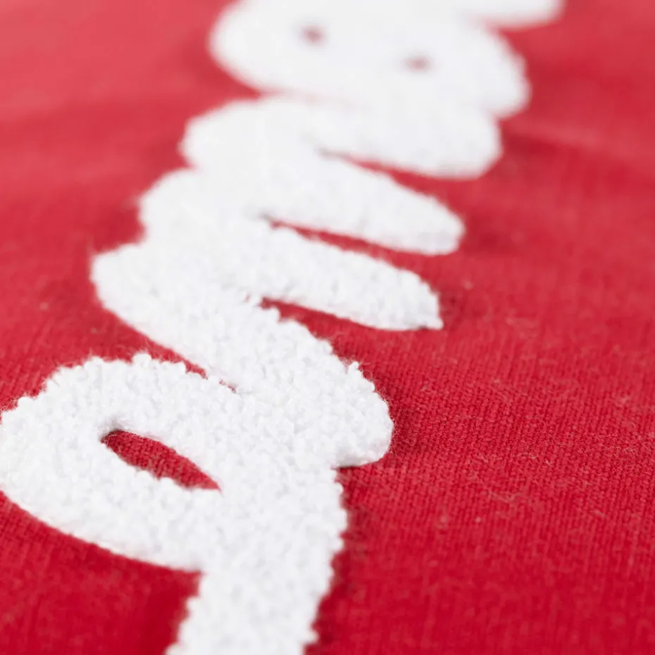 La housse de coussin Monamour arbore une belle broderie blanche sur un fond rouge.