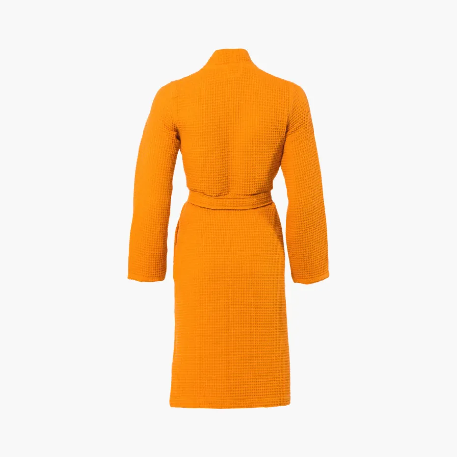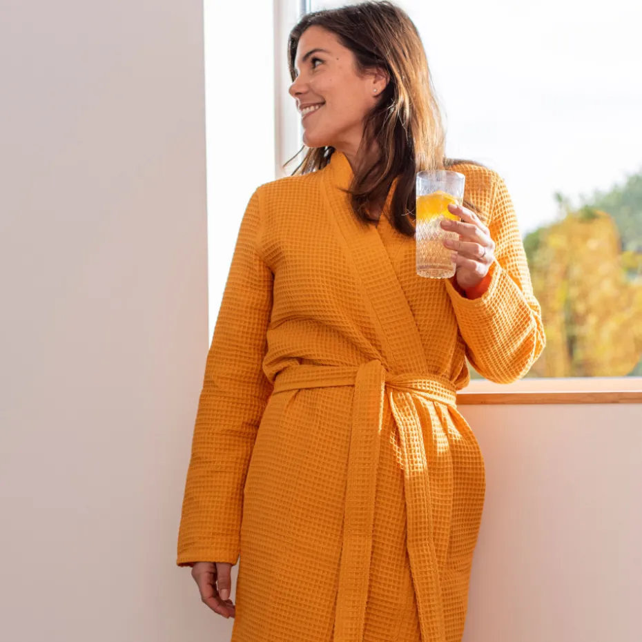 Ce peignoir sèche rapidement grâce à son tissage léger et alvéolé en nid d'abeille.