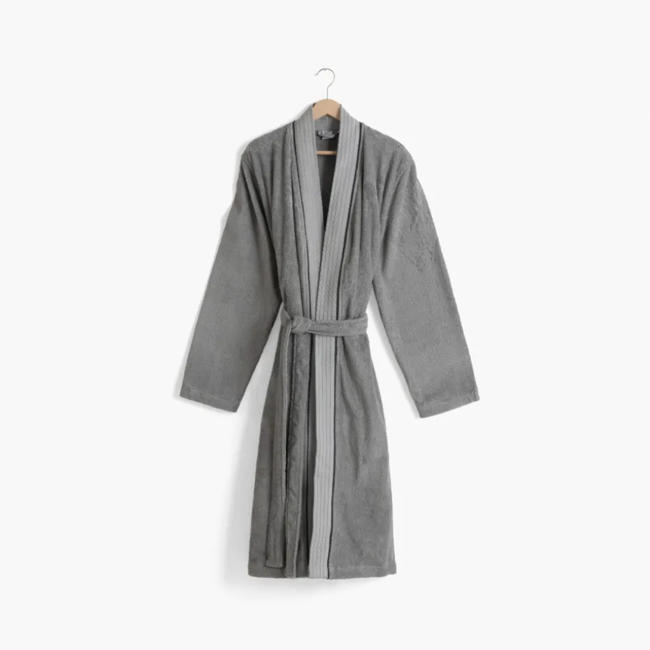 Confectionné en bouclette de coton, le peignoir de bain Equinoxe revêt un coloris gris étain et un col kimono moderne. Laissez-vous séduire par ses finitions subtiles le long du col.
