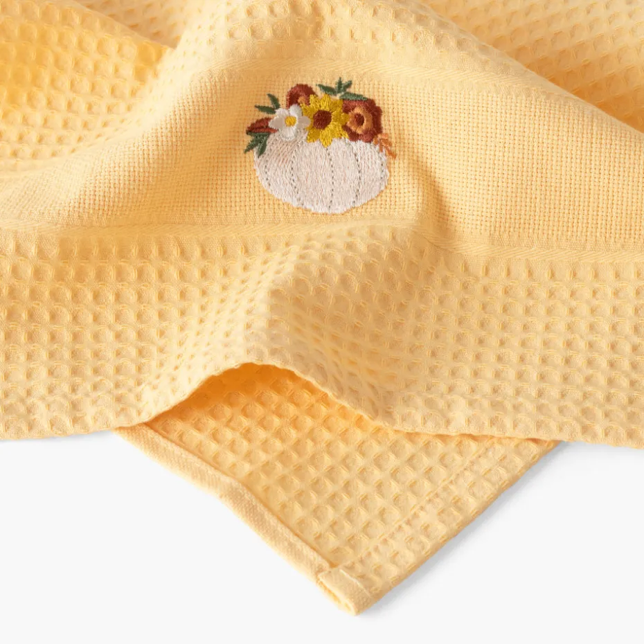 Confectionné en nid d’abeille, le torchon de cuisine Patisson se décline en coloris jaune, vert et sable. Un modèle aux jolis motifs brodés et inspirés de l’automne.