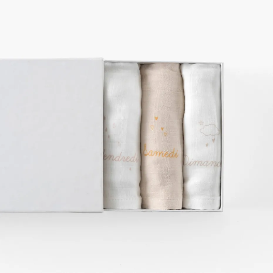 Optez pour le semainier de langes Bienvenue pour célébrer chaque jour avec l’arrivée de bébé. À l’intérieur, vous trouverez 4 langes blancs et 3 langes naturels, le tout soigneusement emballé dans une boîte à tiroirs.