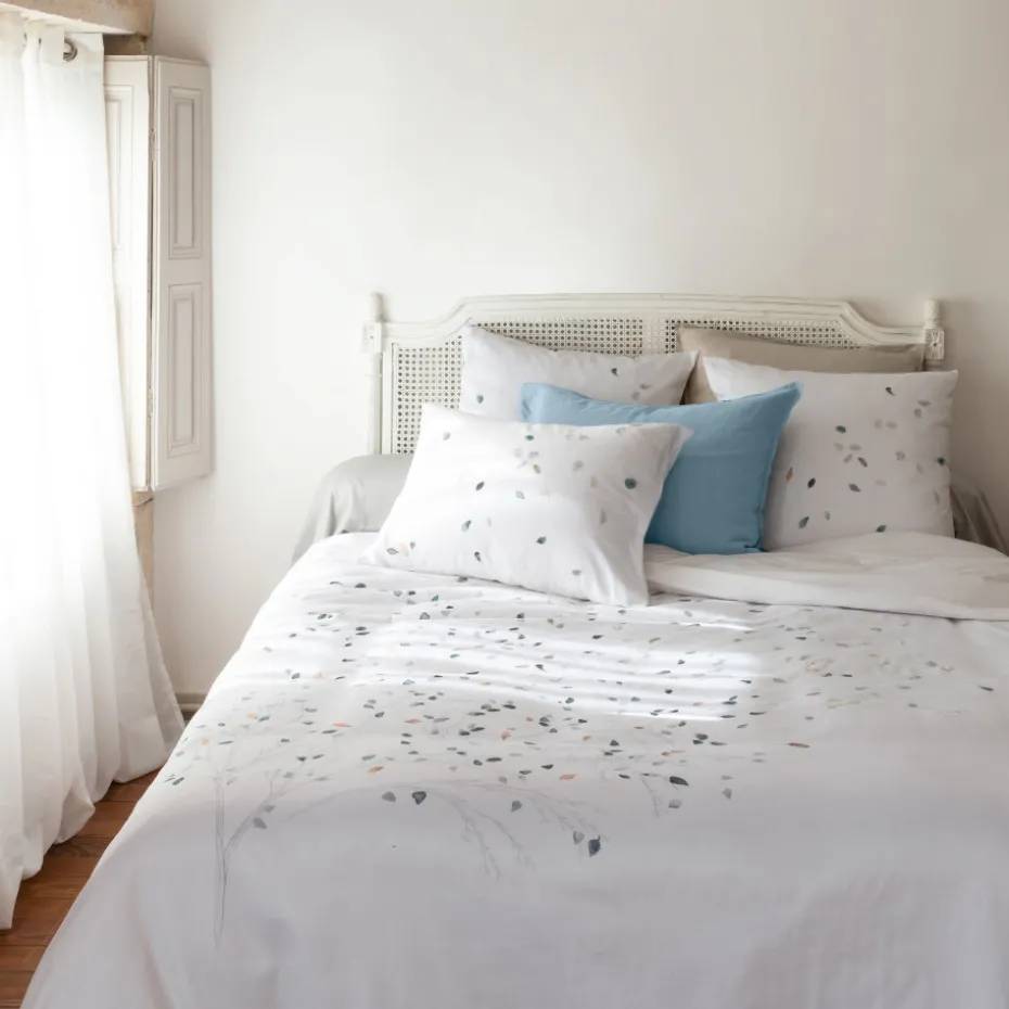 Confectionnée en satin de coton, la housse de couette Equinoxe sublime la chambre à coucher avec ses tonalités givrées et ses motifs scintillants. Une collection précieuse pour les intérieurs élégants.
