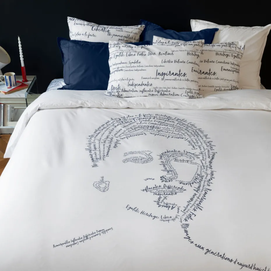 Ce linge de lit au double décor met en scène des visages et des citations de Simones.