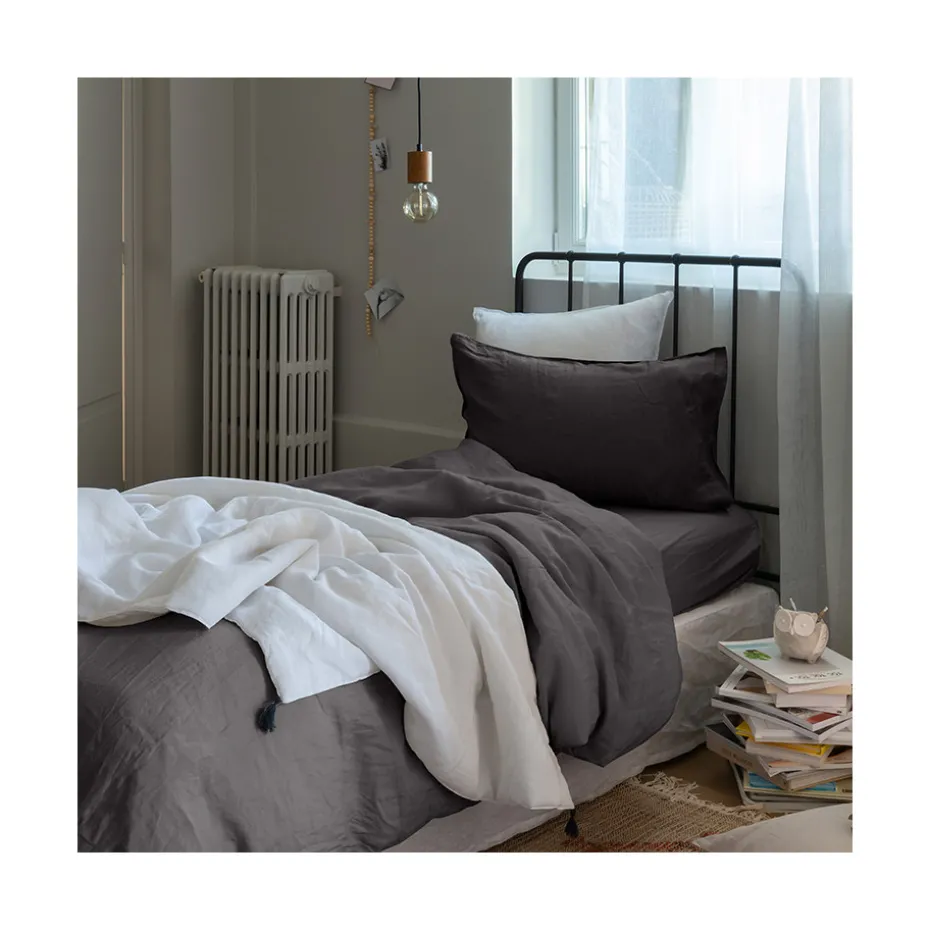 La housse de couette Songe charbon a la particularité d’être bi-matière. Elle dispose d’une face en lin lavé des Flandres 165 g/m² et d’une face en coton lavé 60 fils/cm². Elle est idéale pour toutes les saisons grâce à son pouvoir thermorégulateur qui vous apportera fraîcheur durant l’été et chaleur pour l’hiver. Très tendance grâce à son aspect froissé, vous pourrez l’assortir avec les autres coloris de La collection Songe.