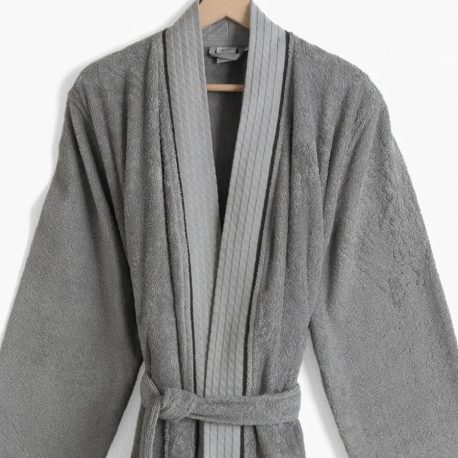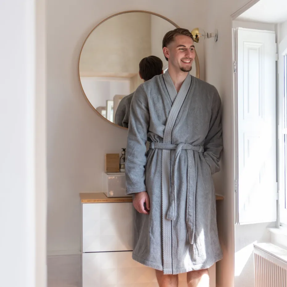 Confectionné en bouclette de coton, le peignoir de bain Equinoxe revêt un coloris gris étain et un col kimono moderne. Laissez-vous séduire par ses finitions subtiles le long du col.