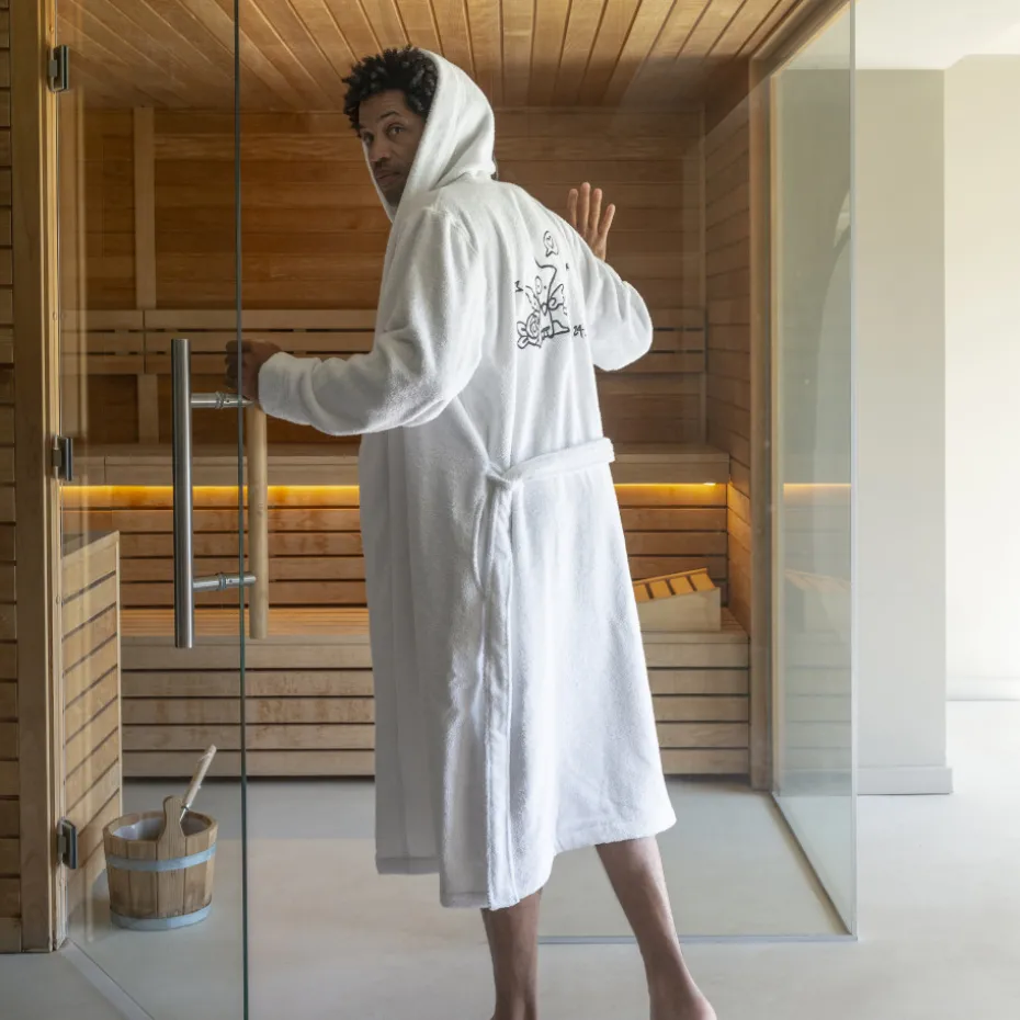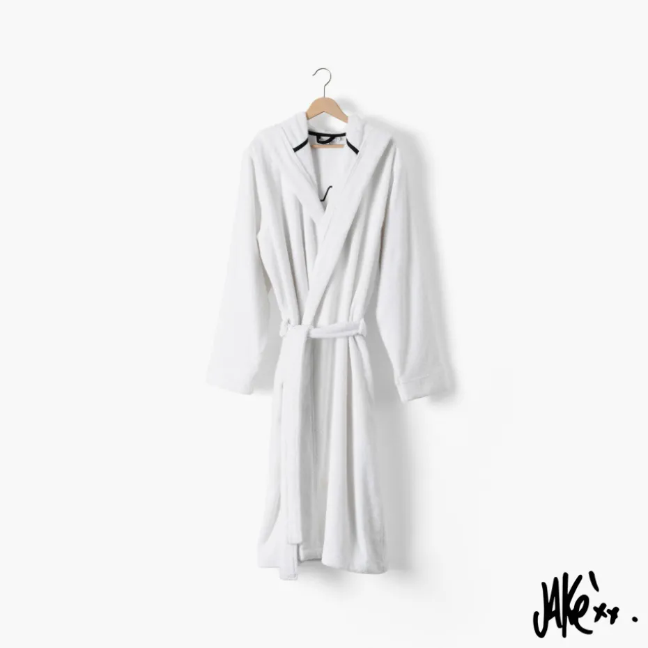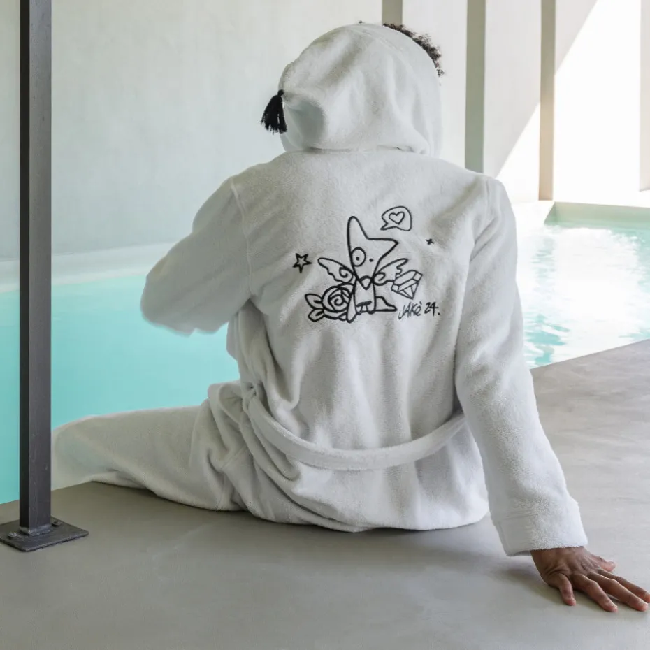 Confectionné à partir de coton, le peignoir Jakè24 vient compléter cette collection capsule unique. Il est doté d’une capuche et de poches intérieures pour plus de confort au quotidien.