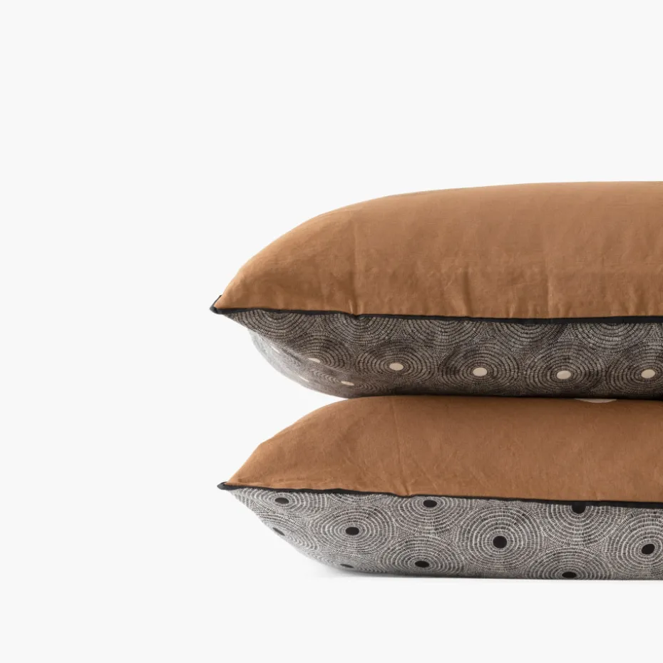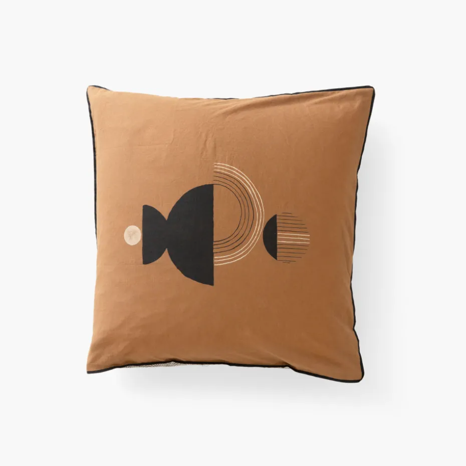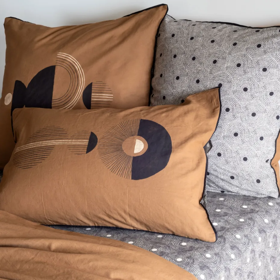 Les adeptes de la décoration bohème vont adorer la taie d’oreiller Eclipse ! Une parure qui joue sur les mélanges des imprimés et le contraste entre les coloris charbon et caramel.