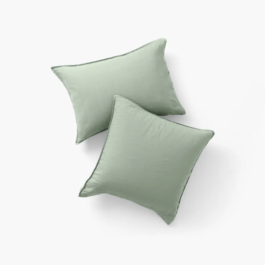 La taie d’oreiller Songe lin/coton a la particularité d’être bi-matière. Elle dispose d’une face en lin lavé des Flandres 165 g/m² très appréciée pour son aspect froissé et son pouvoir thermorégulateur, et d’une face en coton lavé 60 fils/cm² très aimée pour sa douceur au contact de la peau. Laissez-vous séduire par son coloris eucalyptus, à la fois frais et végétal.