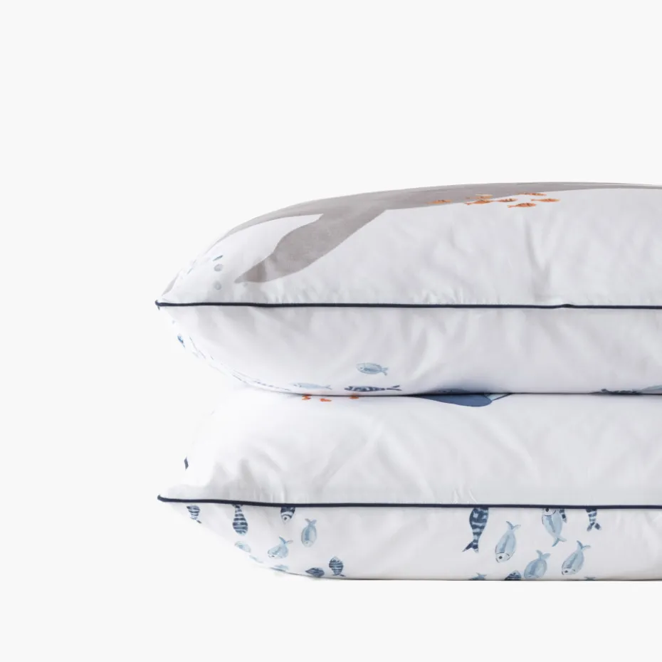 Nos stylistes ont imaginé avec la plus grande tendresse la taie d’oreiller Océanos. Un modèle réversible avec des animaux aquarellés et une charmante rayure formée par un banc de poissons.