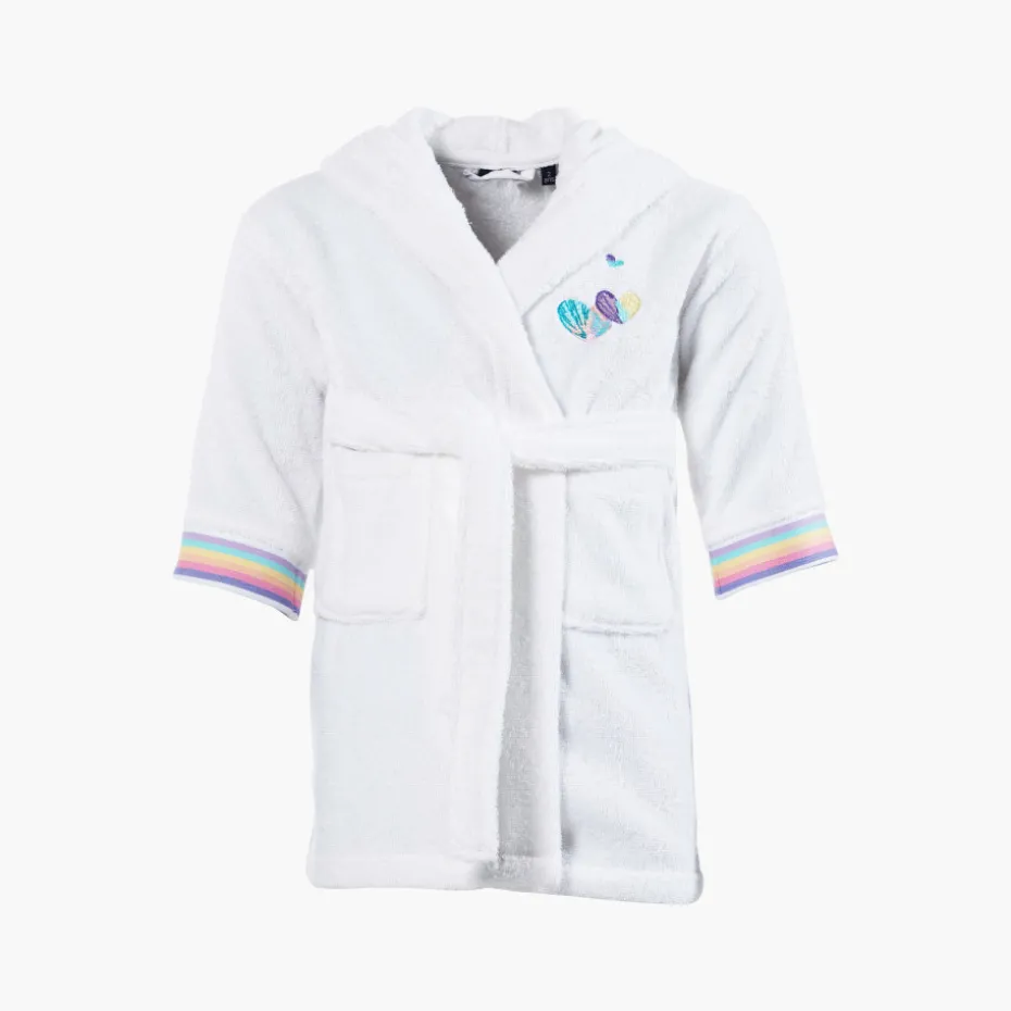 Ce peignoir de bain pour enfant arbore une belle broderie avec des coeurs multicolores.