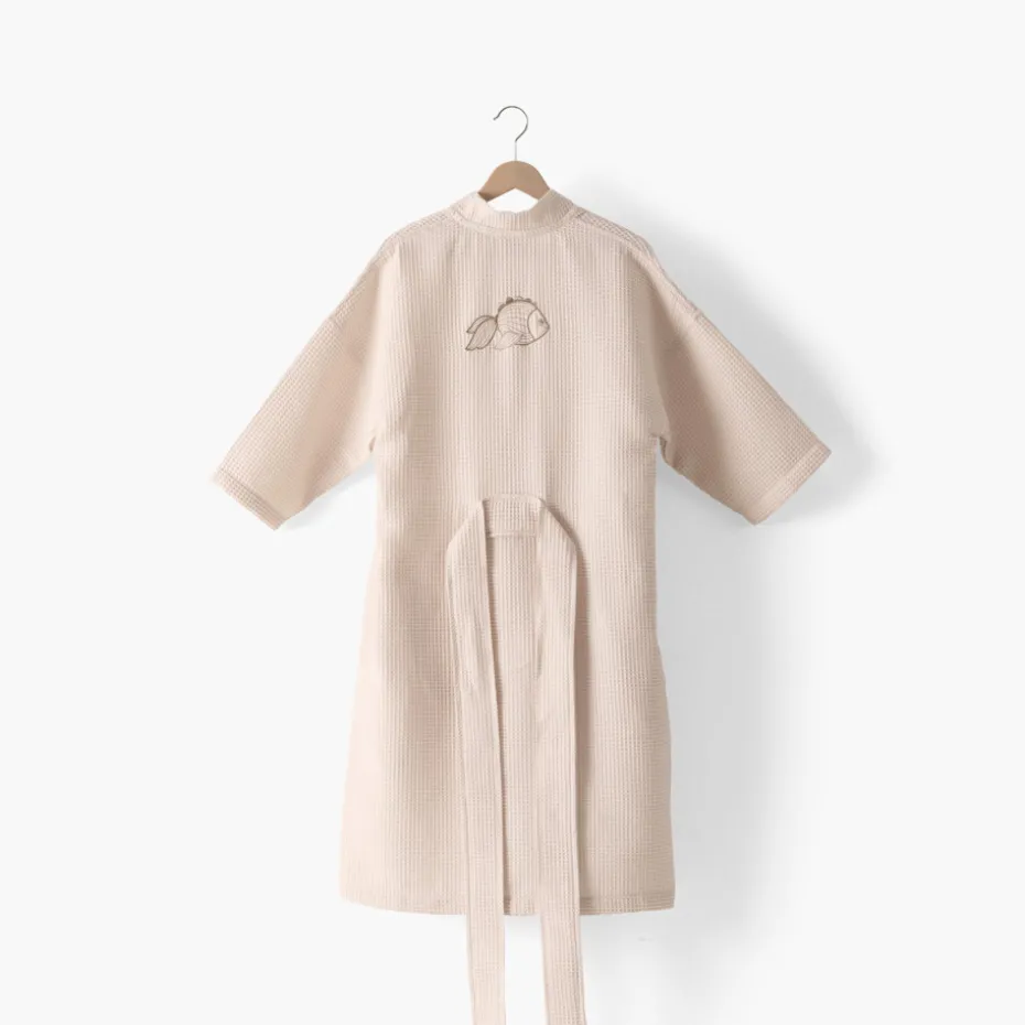 Découvrez le peignoir de bain Amorgos. Sa texture légère en 100 % coton offre douceur, tandis que sa broderie au dos apporte élégance et sophistication à vos rituels de bain.