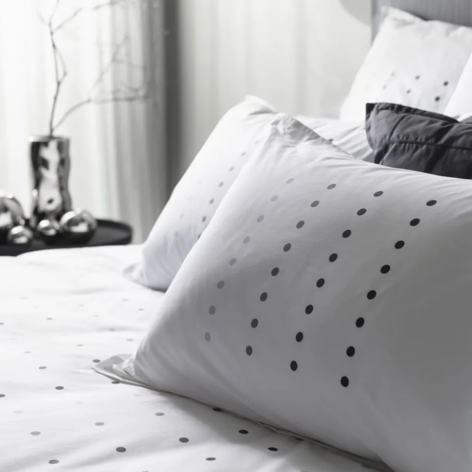 La taie d’oreiller Dotsy en percale de coton vous offre douceur et confort pendant vos nuits. Son motif contemporain en noir est parfait pour les intérieurs classiques et urbains.