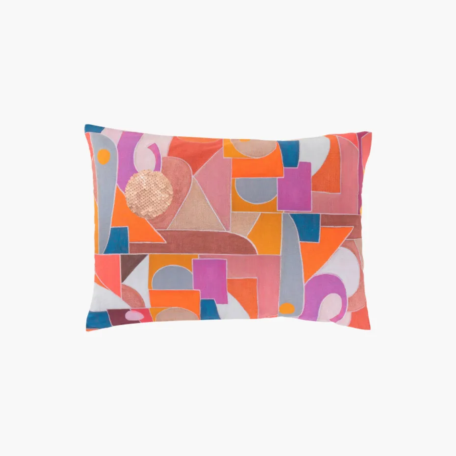 Cette taie d'oreiller au double décor revêt des motifs graphiques et hauts en couleur.