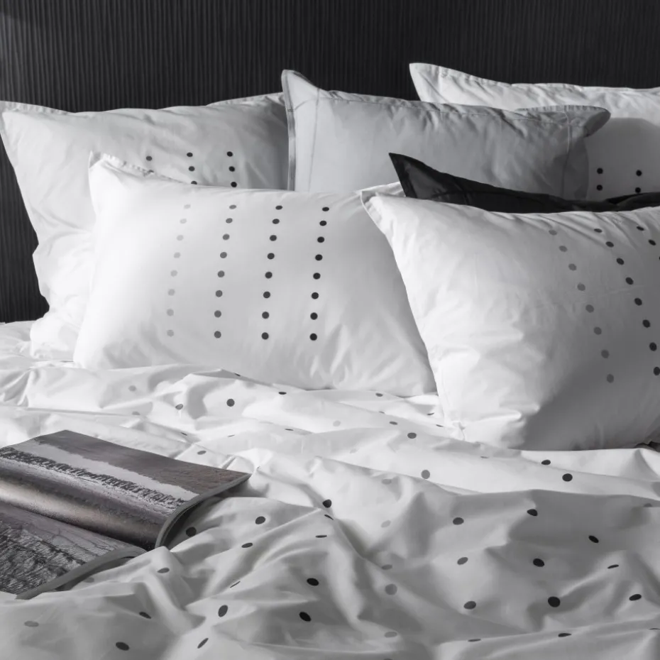 Glissez-vous sous la housse de couette Dotsy en percale de coton. Optez pour un effet graphique avec les lignes de pois et leur camaïeu de gris, le tout présenté en forme de carré.