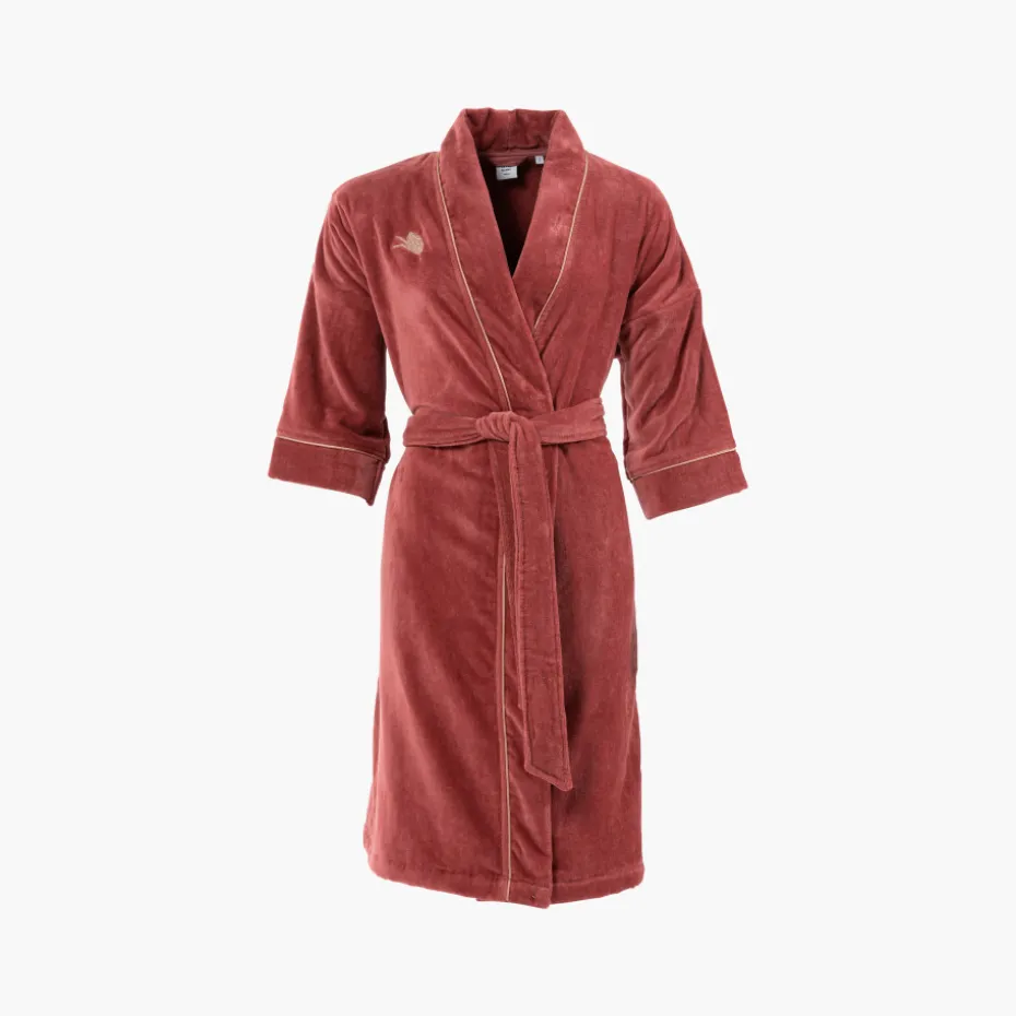 Profitez de doux moments d’évasion avec le peignoir femme Calathéa et son style exotique-chic. Confectionné en velours de coton moelleux, cet accessoire vous séduira par sa douceur et son confort. Elégant et tendance, il revêt une jolie broderie végétale sur la poitrine et un passepoil en satin beige doré le long de l’encolure, le tout dans un coloris terracotta.