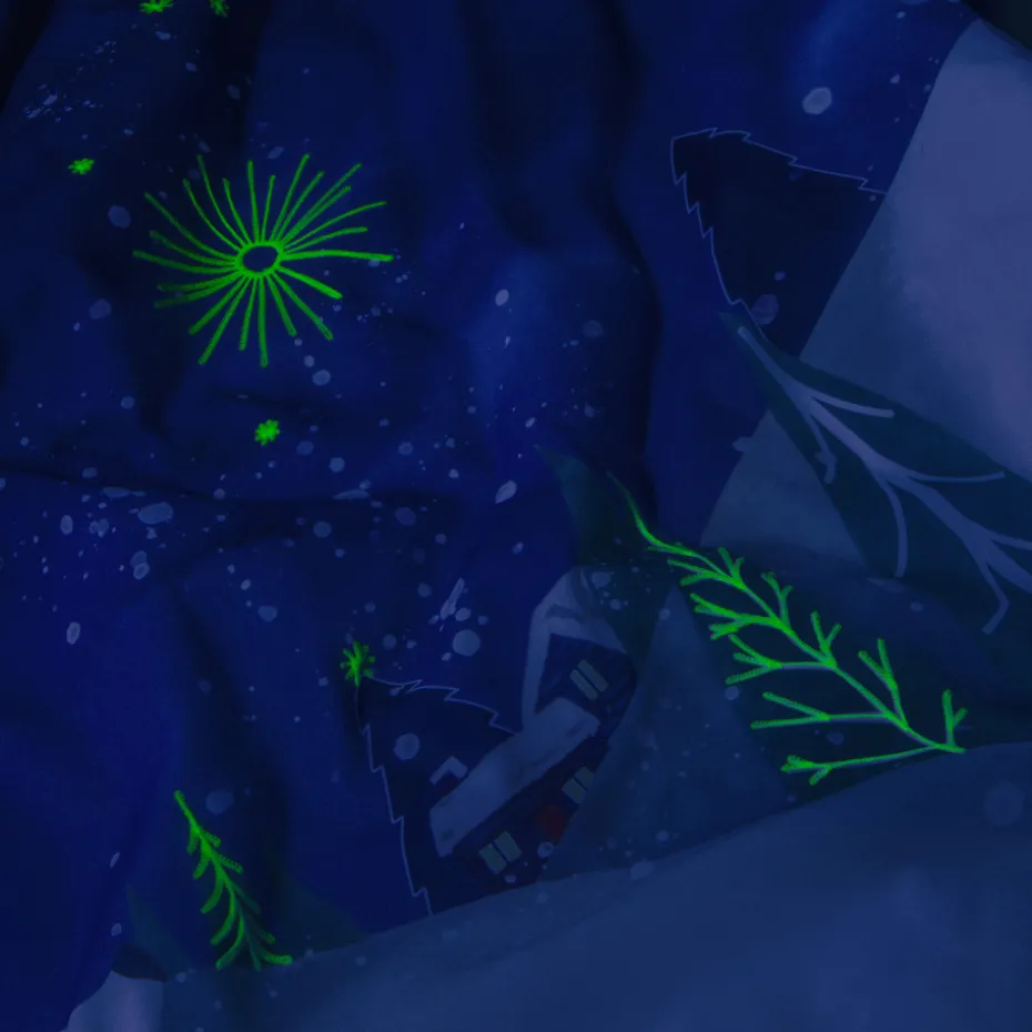 Plongez dans cette magnifique fresque hivernale phosphorescente avec la housse de couette Stellaire. La magie de Noël s’installe dans la chambre de votre enfant pour des nuits enneigées et magiques.
