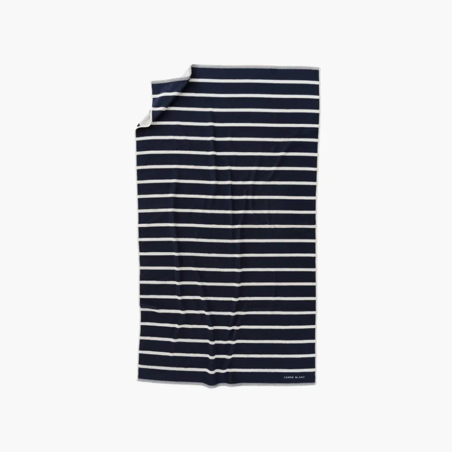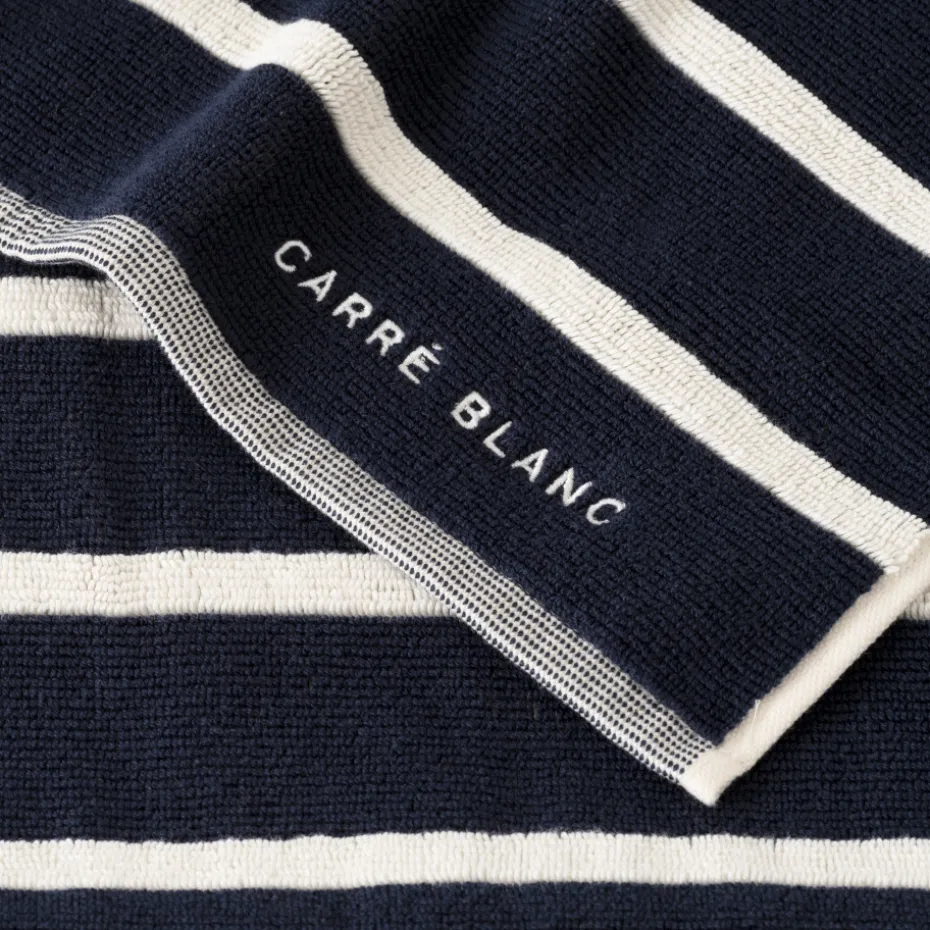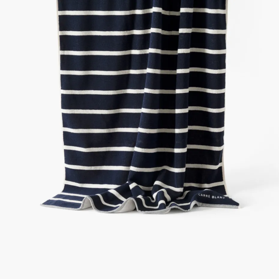 Voyagez instantanément avec le drap de plage Labaule, ses rayures bleues marine ou curcuma évoquant des horizons lointains. Léger et vibrant, il appelle à l’aventure et à la détente, où que vous soyez.