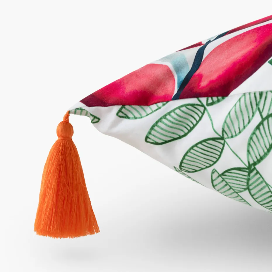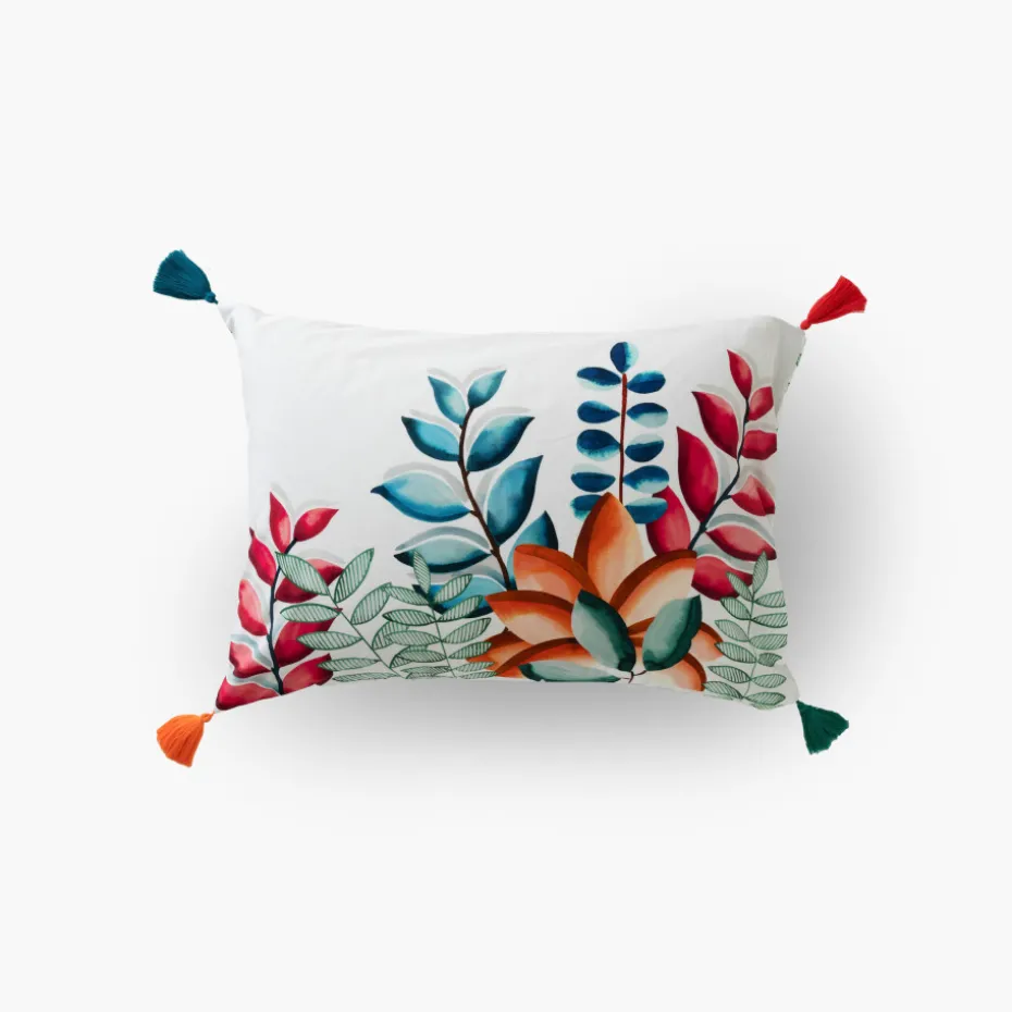 Grâce à son double décor inspiré des célèbres jardins de la Martinique, la collection Balata vous transporte directement sous le soleil des Antilles. Cette taie d’oreiller réversible en percale de coton dépeint une végétation haute en couleurs d’un côté et un imprimé graphique de feuilles vertes de l’autre. Laissez-vous séduire par ses jolis pompons colorés pour habiller votre chambre au printemps-été !