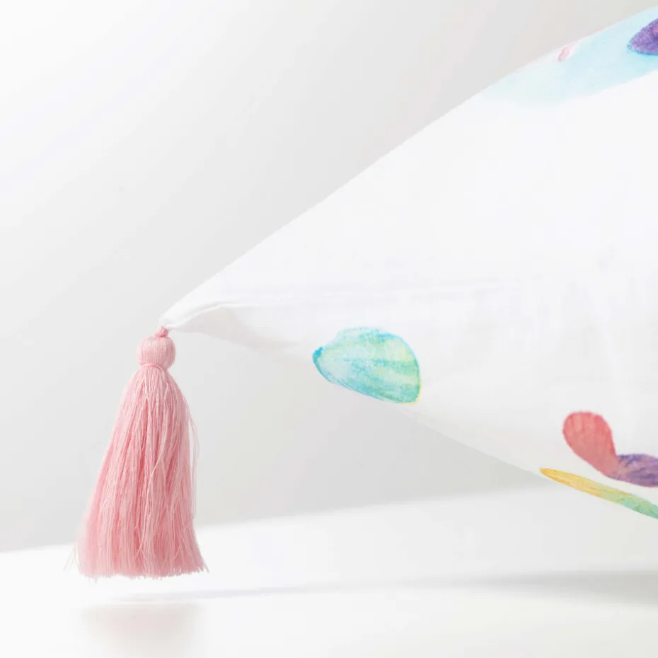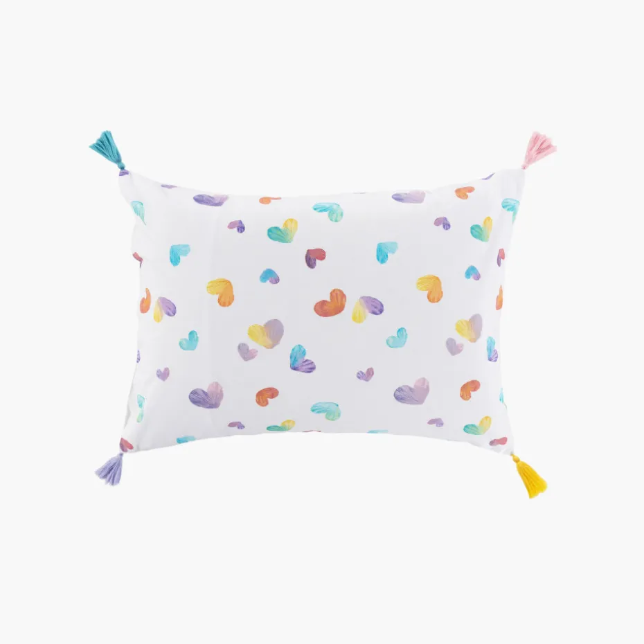 Cette taie d'oreiller arbore des pompons multicolores pour une touche de fantaisie.