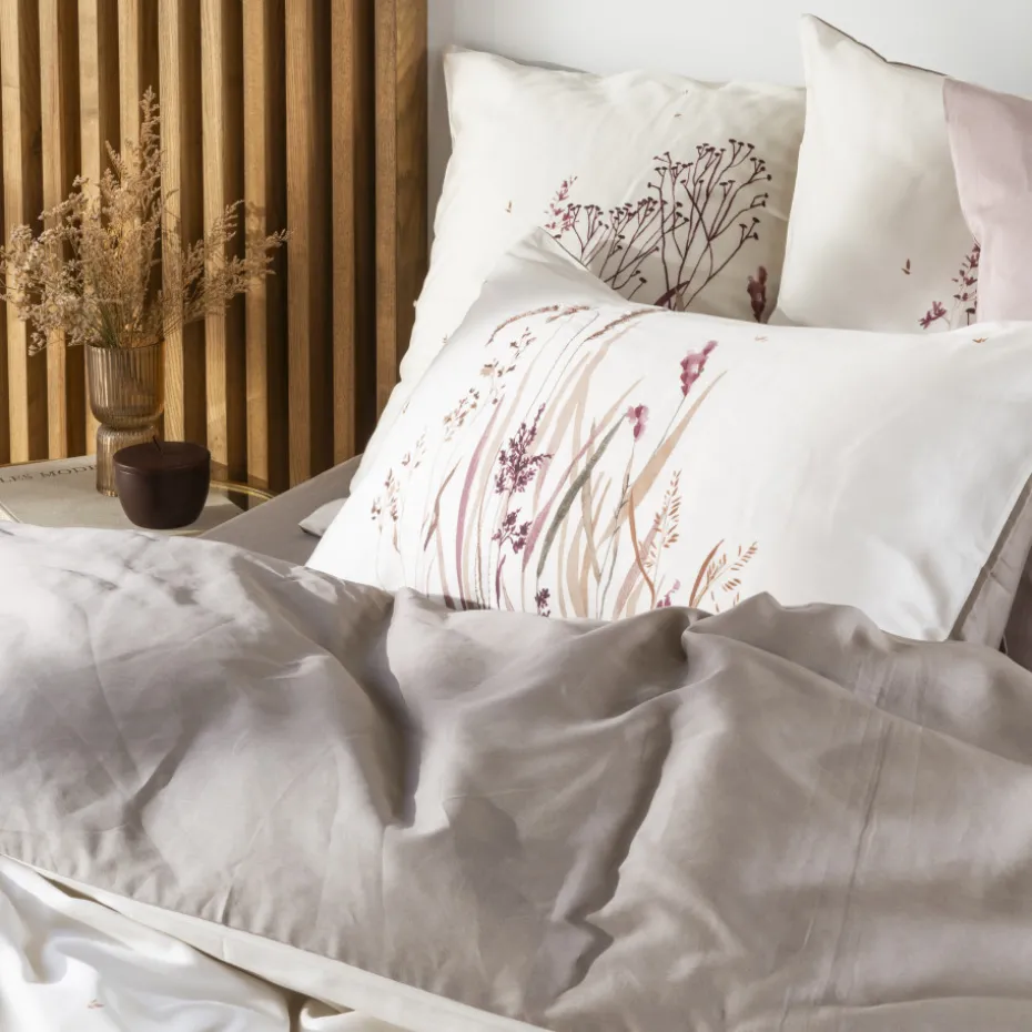 Faites entrer la nature sauvage dans votre chambre avec la taie d’oreiller Aura. Ses deux décors vous permettent de laisser parler votre créativité : optez pour les motifs de prairie et d’herbes hautes ou pour son décor uni taupe.