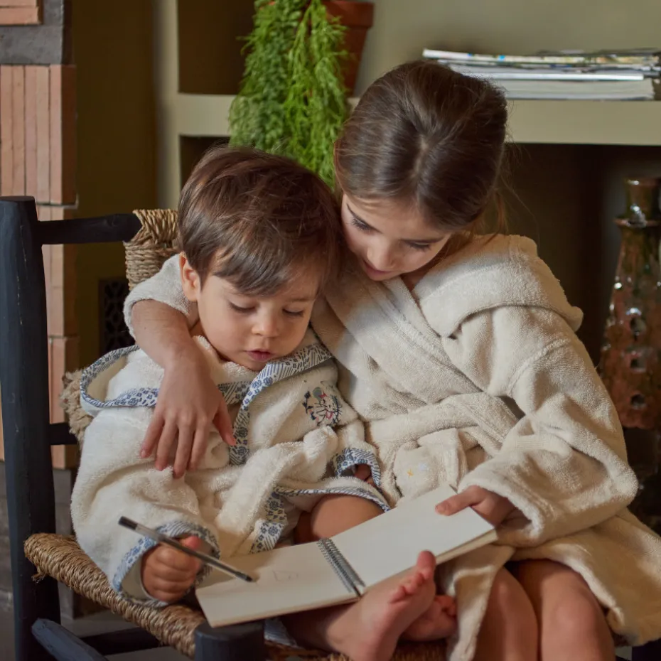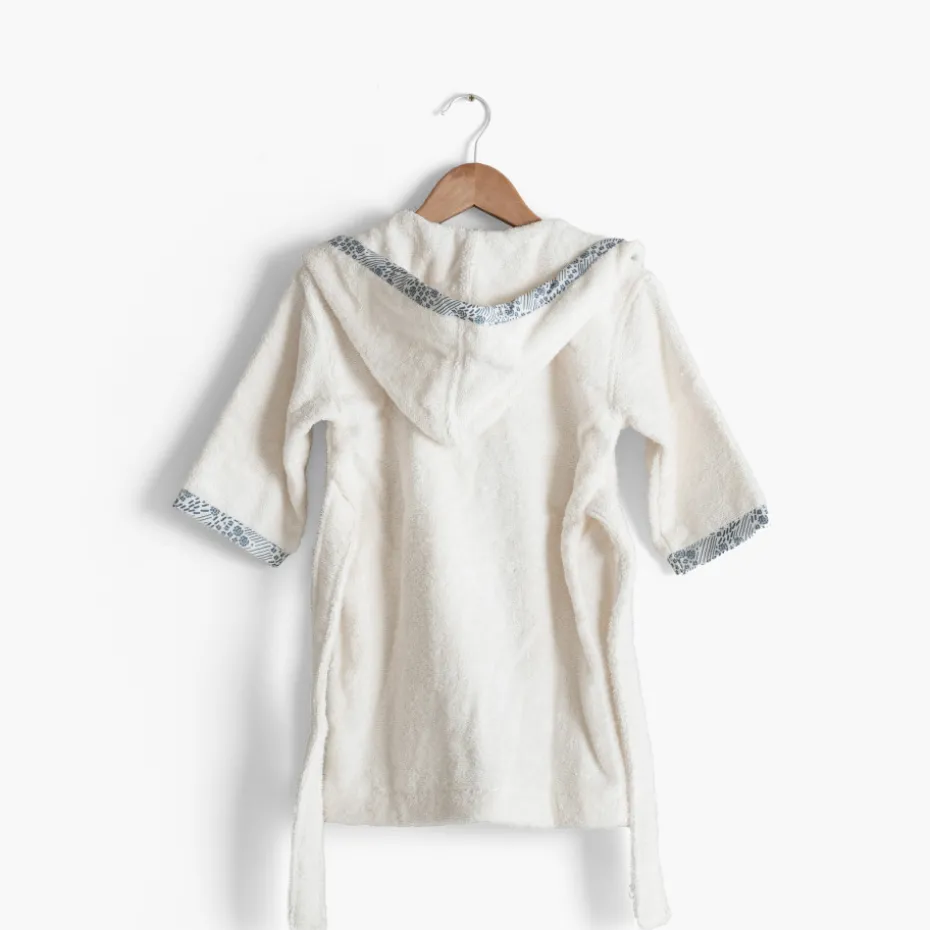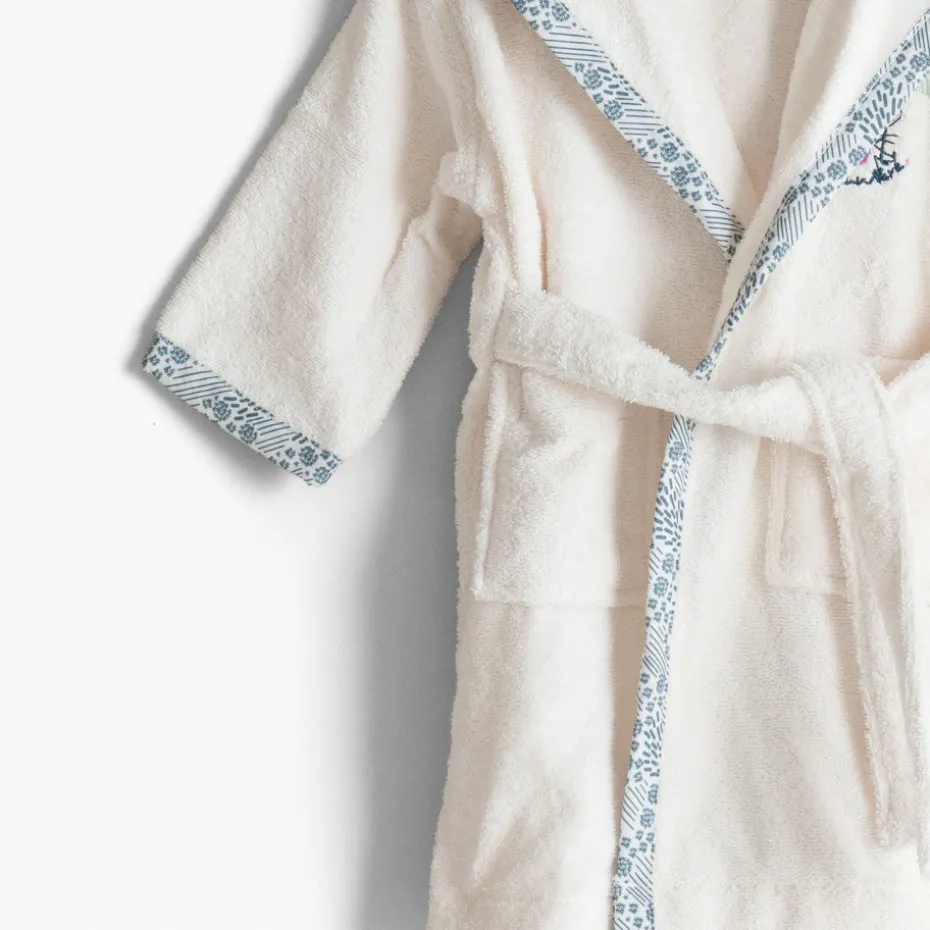 Le peignoir de bain Dandine prend soin des enfants à la sortie du bain grâce à sa composition en coton biologique certifié GOTS. Disponible en coloris ivoire et vert d’eau, cet accessoire de toilette revêt une adorable broderie animalière sur la poitrine et s’accompagne de finitions avec un imprimé graphique le long du col et en bas des manches. Un produit à faire broder pour un cadeau personnalisé !